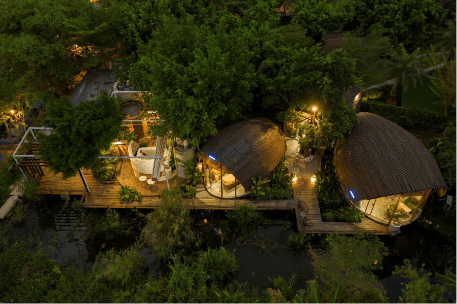 The Spa Bar is a tropical commercial space that combines traditional indigenous materials with modern ones, and most of the lines are curled into curves and ripples. The waves are gentle, harmonious with the light brown, cool green, and a little yellow color of nature so that those who come here can feel the tranquility, soothe the senses and draw new vitality after the noise, the hustle of the city.